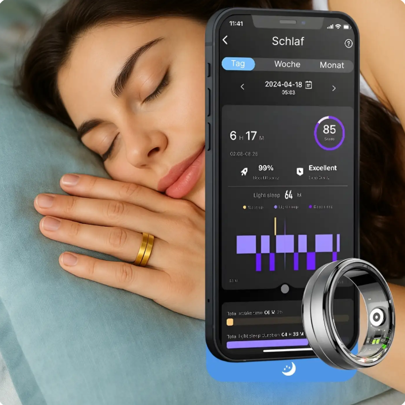Während du schläfst, arbeitet der SmartRing für dich: Er misst deine Schlafphasen präzise und bereitet alle Daten klar und verständlich in der App auf.